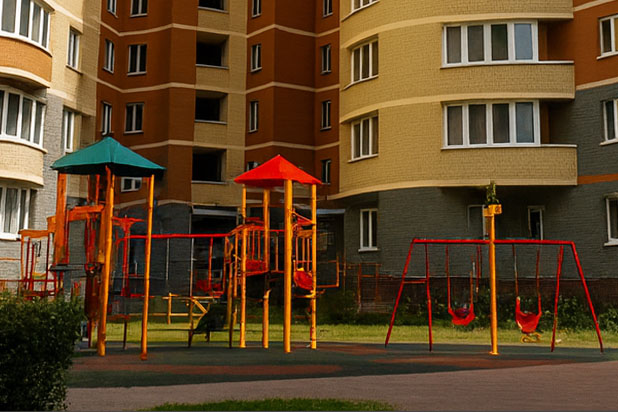 - Для семей — безопасная, спокойная среда с местных услугами, которые работают каждый день. Детская площадка.